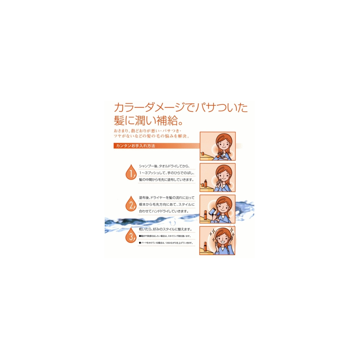 塗布後、ドライヤーを髪の流れに沿って根元から毛先方向にあて、全体に延ばした後、お好みのスタイルにスタイリングして下さい。